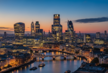 [IMAGE_PROMPT: A professional desk setup in a bright London office, featuring a calculator, a fountain pen, a passport, and a tablet displaying complex financial charts with the London skyline visible through the window.]